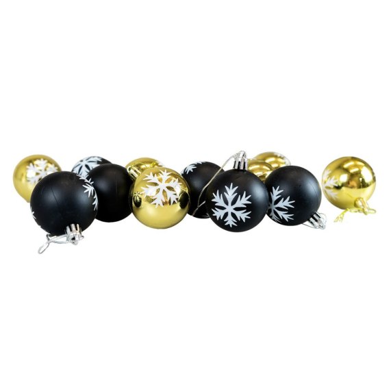 Zestaw bombek w dwóch kolorach to praktyczna i stylowa propozycja dla osób ceniących wygodę i elegancję. W komplecie znajduje się 12 bombek o średnicy 5 cm, zapakowanych w estetyczne pudełko, które ułatwia przechowywanie i przeznaczone jest również do wręczenia w formie upominku. Bombki utrzymane są w kolorze złota i czerni z nadrukiem białych śnieżyk, dzięki czemu pasują zarówno do nowoczesnej choinki jak i klasycznych aranżacji świątecznych.