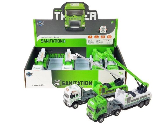 Auto ciężarowe z podnośnikiem 29,5x9,5x7cm, metalowe, światło, dźwięk, display 6szt; 49x10x33cm, Box