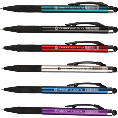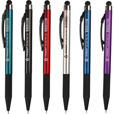 Automatyczny długopis hybrydowy wyposażony w końcówkę do ekranów dotykowych. Plastikowa obudowa w 6 metalicznych kolorach. Wymienny wkład olejowo-żelowy w kolorze niebieskim. Miękki, gumowy uchwyt. Precyzyjna końcówka pisząca z niklowanego srebra. Grubość linii pisania: 0,7 mm. Klips umożliwiający wpięcie długopisu w dogodnym miejscu. Pakowany w display po 36 sztuk.