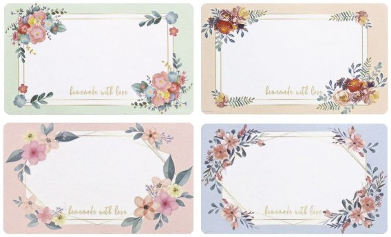 Etykiety samoprzylepne 50 x 30 mm, na rolce, 4 kolory/wzory kwiatowe. 250 sztuk.