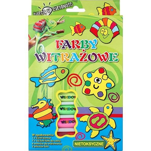 Zestaw farb witrażowych świecących w ciemności. Przeznaczone do dekoracji szkła, porcelany i tworzyw sztucznych. Zestaw zawiera: 1 czarny kontur 22 ml, 7 kolorów po 10,5 ml oraz arkusz z 6 wzorami + 2 arkusze folii.