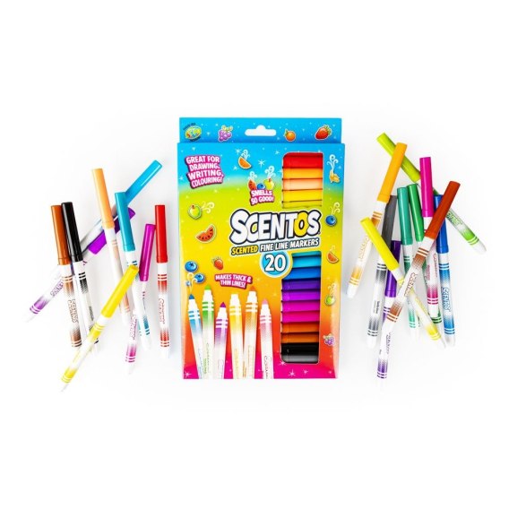 Ten zestaw pachnących flamastrów bez trudu zastąpi dwa rodzaje mazaków! Wszystko za sprawą końcówki, która umożliwia rysowanie zarówno grubej, jak i cienkiej, precyzyjnej linii. Zestaw zawiera aż dwadzieścia flamastrów, różniących się kolorem i zapachem.