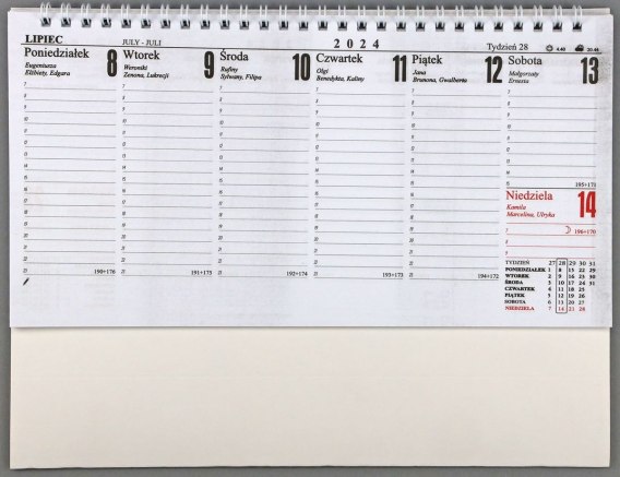 KALENDARZ BIURKOWY POZIOMY 135x260– druk dwukolorowy, 3-języczne kalendarium, wschody i zachody słońca, fazy księżyca, święta narodowe i kościelne. Podstawka wykonana z kartonu 350 r. bindowana, oprawa spiralowana. Papier 80 g