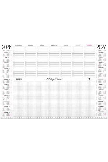 Kalendarz 2026/2027 biurkowy BIUWAR, PODKŁAD NA BIURKO FORMAT A2 DUŻY. Oprawa klejona na podstawie kartonowe. Format 594/420mm. Papier 80g/m. 33 karty w bloku. LISTWA TRANSPARENTNA ZAMONTOWANA NA DOLNEJ KRAWĘDZI KALENDARZA. Kalendarz zawiera skrócone kalendaria na rok 2026 i 2027, miejsce do notatek i tygodniowy rozkład zajęć oraz praktyczną linijkę.