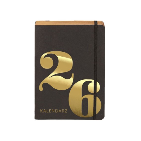 Format: A5, wymiary okładki: 207x141 mm, układ: dzień na stronie, ilość stron: 352, oprawa: miękka, materiał: papier, gramatura papieru: 80g, kolor papieru: chamoise, dodatki: plan roku 2026, ważne wydarzenia, skorowidz adresowy, notatki, pionowa gumka zamykająca: czarna, wstążka: czarna, zaokrąglone rogi, wyklejka: czarna