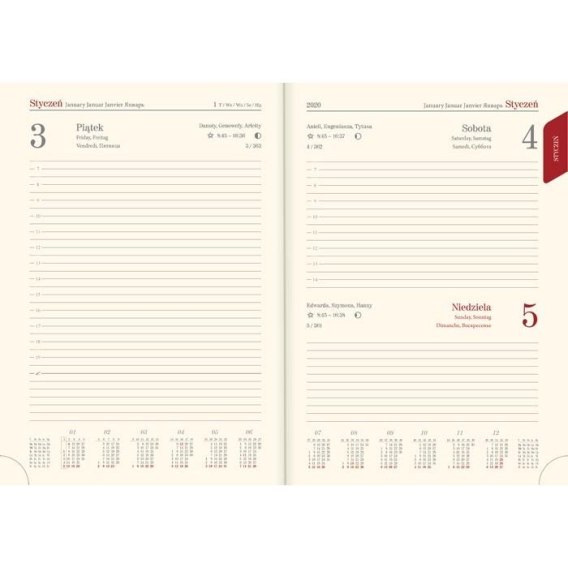 - kalendarium zawiera m.in.: numeracje dni i tygodni roku, fazy Ksieżyca, godziny wschodu i zachodu Słonca, po trzy imiona