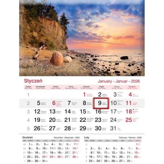 druk: zdjęcie jednostronny barwny + folia błysk; kalendarium jednostronny, barwny;