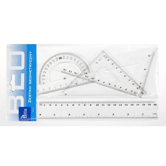 Komplet zawiera: 2 ekierki, linijkę, kątomierz.