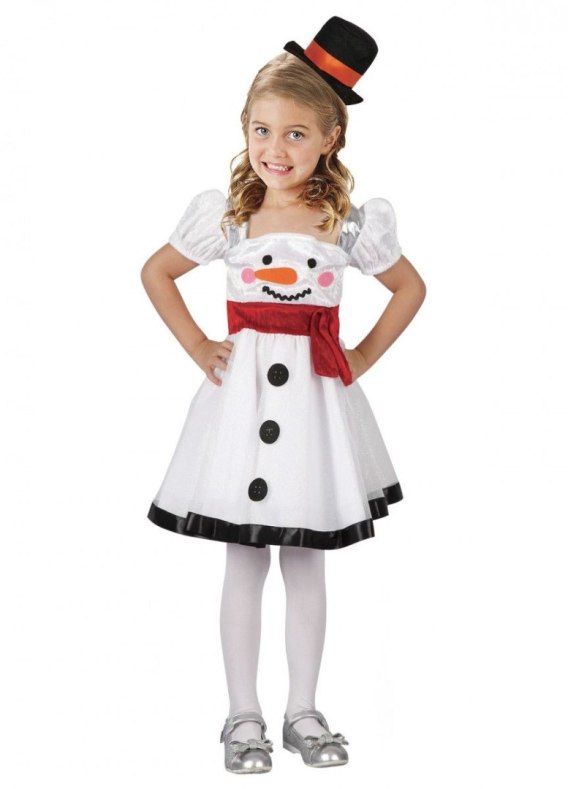 Dziecięcy strój zimowy, świąteczny bałwanek. Komplet składa się z sukienki oraz opaski na głowę. Sukienka z nadrukiem bałwanka, wierzchnia warstwa pokryta brokatem imitującym iskrzący się śnieg na mrozie. Sukienka posiada halkę utrzymującą ładną, rozkloszowaną formę po założeniu. Kapelusz bałwanka został umocowany na opasce na głowę zapewniając wygodę noszenia. Dziecięcy strój na zabawę tematyczną lub przedstawienie. Strój w rozmiarze S (110-120 cm).