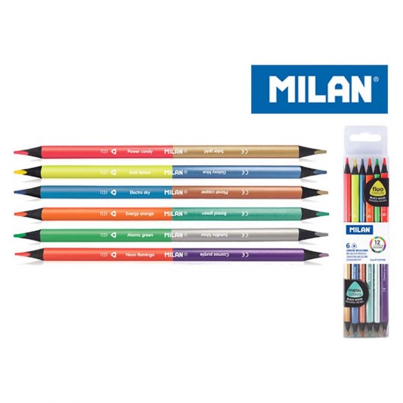 Kredki ołówkowe cienkie, dwustronne 6 sztuk = 12 kolorów. Średnica grafitu 2,9 mm. Z jednej strony kolory metaliczne a z drugiej fluorescencyjne. Ergonomiczny trójkątny kształt. Wykonane z czarnego lipowego drewna. Posiadają unikalny system Lead Protection System (LPS), który zwiększa odporność grafitu na złamania poprzez przyklejenie go do drewna. Drewno jest wytrzymałe i miękkie umożliwiając łatwe temperowanie. Wysokiej jakości pigmenty w żywych, intensywnych kolorach są odporne na działanie światła. Kreska wykonana kredką MILAN jest miękka, jednolita o wyraźnym odcieniu. Nie tworzy rowków ani nie niszczy papieru. Drewno pochodzi ze zrównoważonych plantacji. Każda kredka ma nadrukowaną nazwę koloru po angielsku. Kredki MILAN są zgodne z europejskimi i amerykańskimi normami bezpieczeństwa. Nie zawierają ftalanów, metali ciężkich i innych substancji toksycznych. Są bezpieczne dla dzieci. Rozmiar kredki: 17,5 x ø 0,62 cm. Rozmiar opakowania: 21,8 x 4,4 x 0,8 cm.