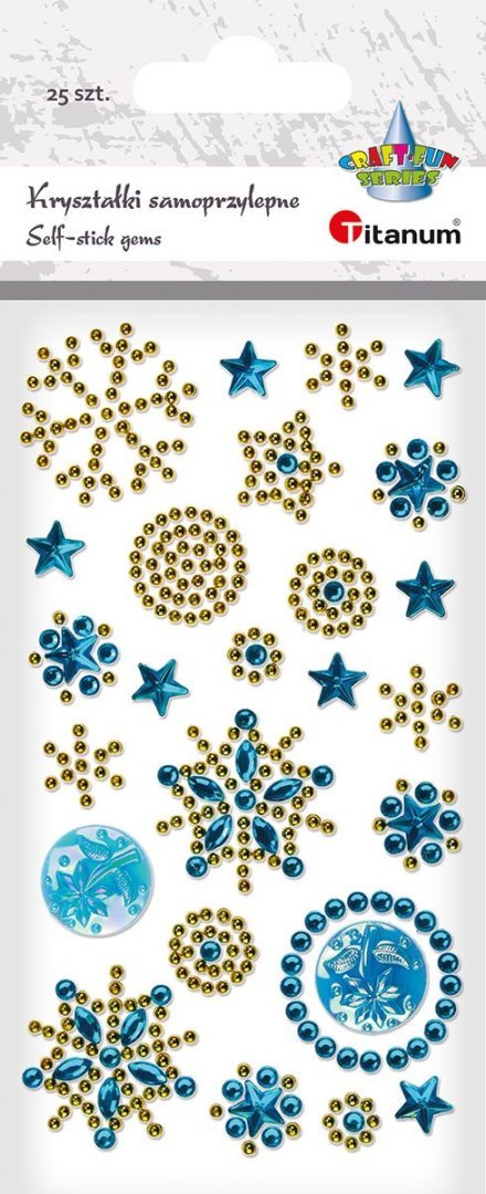 Kryształki samoprzylepne, wzory: płatki śniegu, gwiazdki, okręgi, kolory: turkusowo-złote. 25 sztuk.