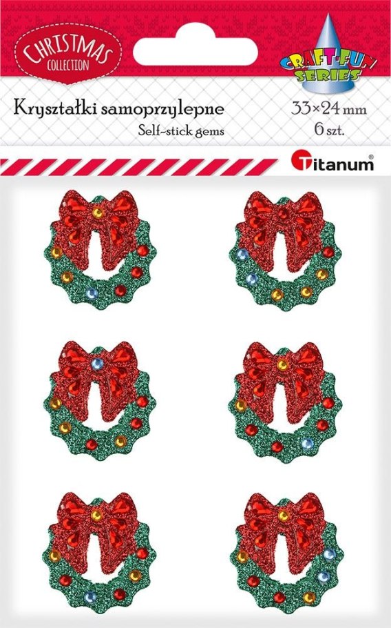 Kryształki samoprzylepne, wzór: wianki bożonarodzeniowe, wymiary: 24x33 mm. 6 sztuk.