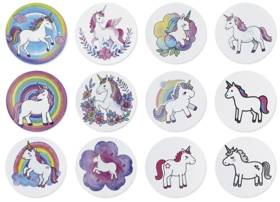 Naklejki papierowe na taśmie, 12 wzorów jednorożce, średnica 25 mm, szerokość taśmy 27 mm. 500 sztuk.