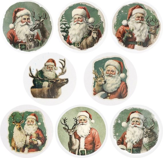 Naklejki papierowe na taśmie, średnica 25 mm, 8 wzorów Boże Narodzenie - Mikołaj vintage. 500 sztuk.