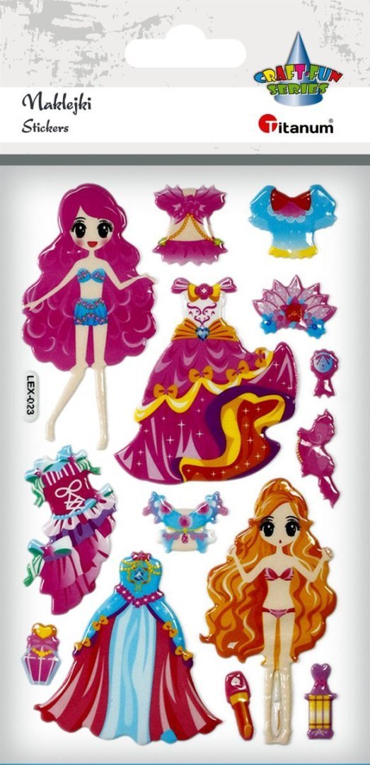Naklejki wypukłe. Wzór: lalki i stroje. 14 sztuk.