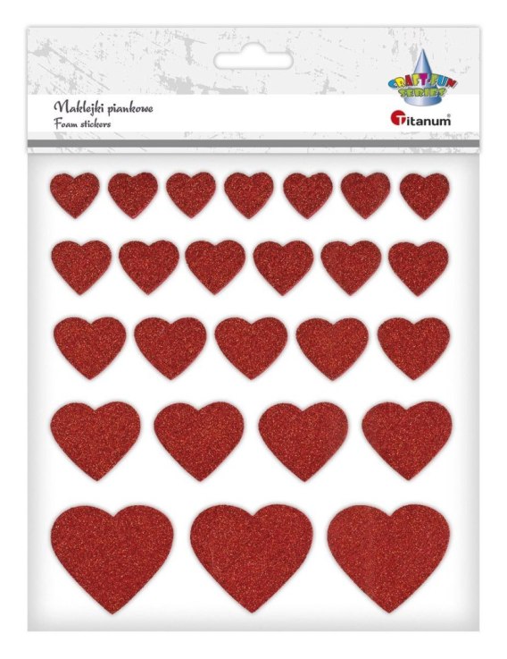 Naklejki piankowe brokatowe, wzór: serca, wymiary: 20x18mm, 24x22mm, 29x25mm, 37x32mm, 49x44mm, kolor: czerwone. 25 sztuk.