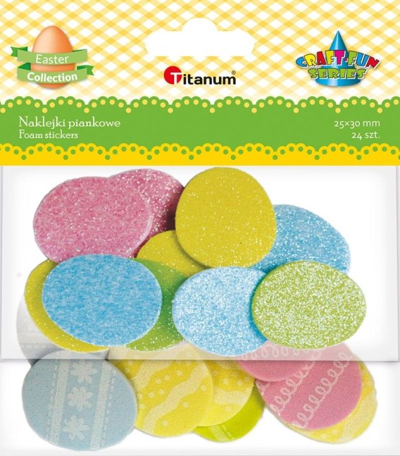 Naklejki piankowe, wzór: pisanki brokatowe i gładkie, wymiar: 27 x 32 mm. 24 sztuki.