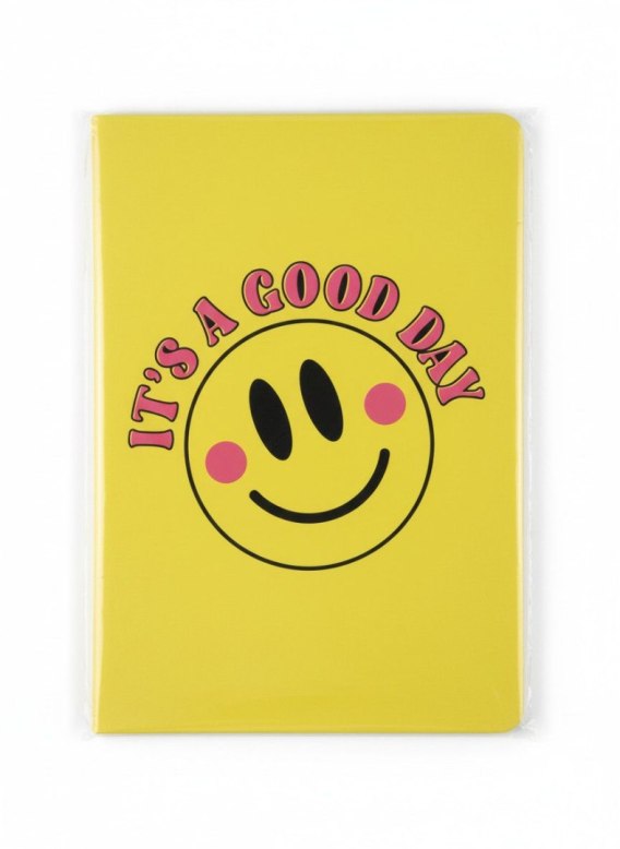 Notes A5 w linie zawiera 96 kartek. Papier o gramaturze 80g. Notatnik posiada gumkę/uchwyt na długopis oraz wstążkową zakładkę. Zarówno okładka oraz kartki zaokrąglone na rogach. Twarda oprawa zdobiona dodatkowo ciekawym napisem GOOD DAY. Dzięki eleganckie