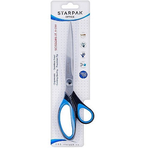 Starpak oferuje również nożyczki biurowe. O długości od 14,5 do 25,5 cm. Nożyczki są oczywiście wykonane z odpornej, wysokogatunkowej stali. Plastikowe lub gumowane raczki zapewniają komfort użytkowania.