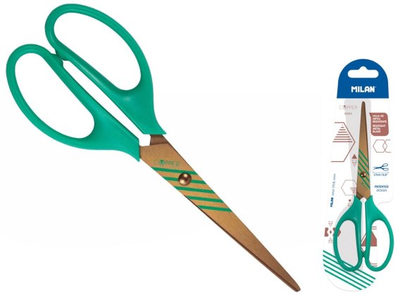 Nożyczki biurowe z serii COPPER. Uchwyty w kolorze zielonym, a ostrze w kolorze miedzianym (copper) z zielonymi detalami. Długość 17 cm. Ostrze ze stali nierdzewnej z zaostrzoną końcówką, która umożliwia większą precyzję cięcia, nawet drobnych elementów. Symetryczny plastikowy uchwyt, odpowiedni również dla leworęcznych. Oryginalny produkt stworzony przez własny dział badawczo-rozwojowy MILAN. Rozmiar nożyczek: 17 x 5,9 x 1,2 cm.