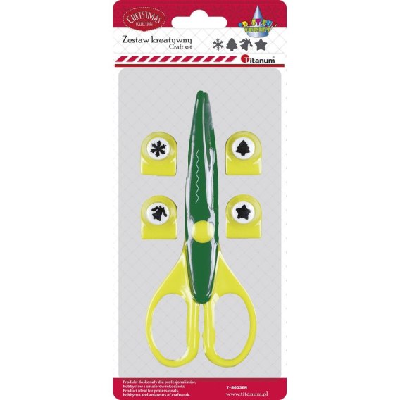 Zestaw kreatywny składający się z nożyczek oraz dziurkaczy z ozdobnymi bożonarodzeniowymi motywami. Zestaw zawiera: 1 nożyczki dekoracyjne (długość całkowita: 15,5 cm), 4 dziurkacze kreatywne (wzór o rozmiarze: 1 cm).