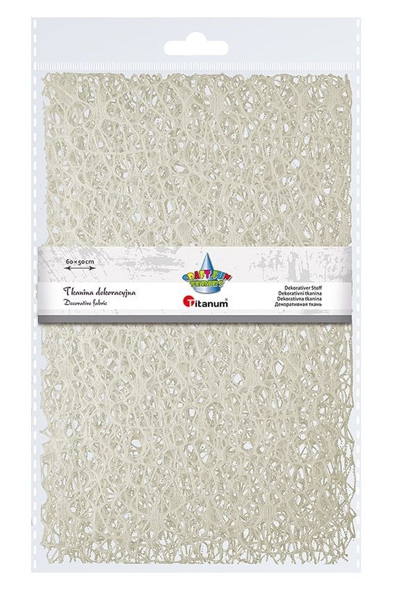 Arkusz miękkiej siatki dekoracyjnej z syntetycznych nici. Zastosowanie: florystyka (dekoracja bukietów, kompozycji kwiatowych, stroików), pakowanie prezentów (także jako wypełnienie pudełek prezentowych), dekoracja sal na przyjęcia, ozdabianie stołów. Wymiary: 60 x 50 cm, kremowa.