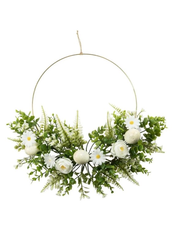 Dekoracja na obręczy to elegancka ozdoba wiosenno-wielkanocna, która łączy w sobie naturalny wygląd zieleni z subtelnymi akcentami florystycznymi i dekoracyjnymi jajkami. Kompozycja osadzona na metalowej obręczy prezentuje się lekko i nowocześnie, wprowadzając do wnętrza świeży, harmonijny klimat. Starannie dobrane elementy roślinne oraz delikatna kolorystyka sprawiają, że dekoracja doskonale pasuje zarówno do klasycznych, jak i minimalistycznych aranżacji. Średnica 38 cm czyni ją wyrazistym, a jednocześnie estetycznym elementem sezonowego wystroju.