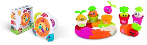 Wesoły 2-języczny (angielski/polski) zegar , który poprzez zabawę pomoże Maluszkowi w nauce cyfr, godzin i rozpoznawania kształtów. Kiedy dziecko zacznie przesuwać wskazówkami usłyszy ustawioną przez siebie godzinę. Po przełączeniu na „Quiz" Maluszek będzie miał za zadanie wskazać odpowiednią godzinę. Dodatkowo wesołe melodie i świecące przyciski zachęcą dziecko do zabawy. Zegar posiada wygodny do przenoszenia uchwyt, dzięki któremu Maluszek może zabrać go wszędzie ze sobą.