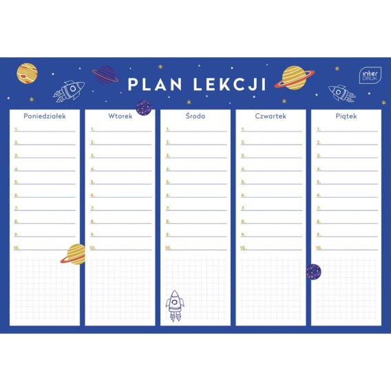 Plan lekcji z miejscem na notatki w poręcznym formacie A4. Wykonany z papieru kredowego.