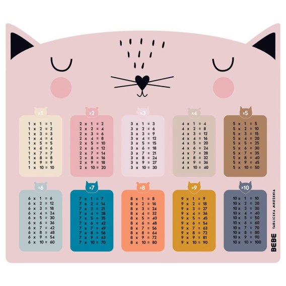 Dwustronna pomoc dydaktyczna z tabliczką mnożenia w formie klasycznej i kolorowej tabelki w kształcie ulubionego zwierzaka BEBE Friends.