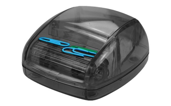 Ergonomiczny pojemnik do spinaczy biurowych z wytrzymałego plastiku, z magnetyczną rolką ułatwiającą wyjmowanie spinaczy. Antypoślizgowy spód. Dostępny w dwóch kolorach: białym i czarnym.