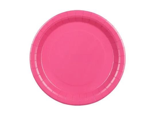 Talerzyki papierowe okrągłe w kolorze ciemnoróżowym, średnica ok. 23 cm.