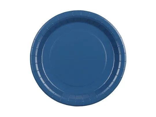 Talerzyki papierowe okrągłe w kolorze granatowym, średnica ok. 23 cm.