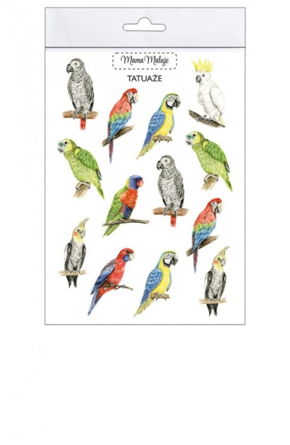 Tatuaże zmywalne Papugi zostały wykonane na podstawie ręcznie malowanych ilustracji akwarelowych. Uwzględniają szczegóły każdego kolorowego ptaka. Na arkuszu znajduje się 13 tatuaży.