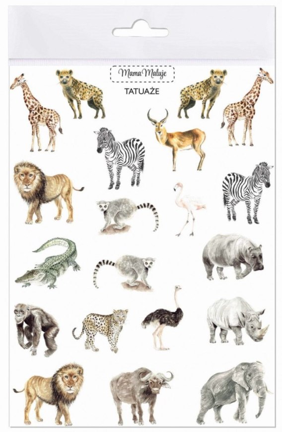 Tatuaże zmywalne Zwierzęta Afryki zostały wykonane na podstawie ręcznie malowanych ilustracji akwarelowych. Uwzględniają szczegóły i wyjątkowy charakter każdego zwierzęcia. Na arkuszu znajduje się 20 tatuaży.