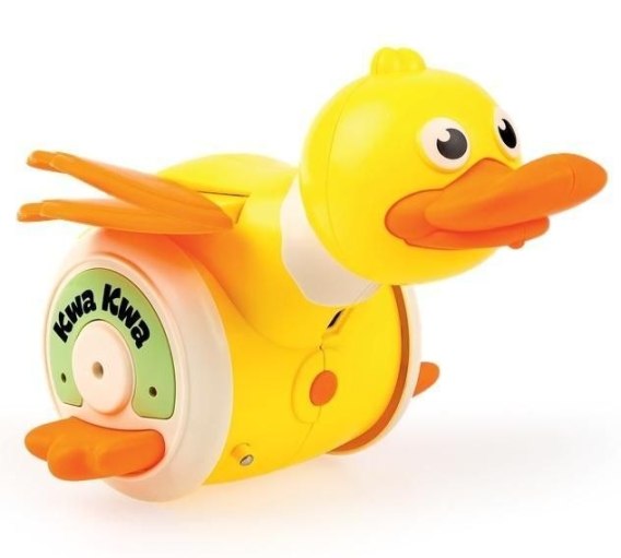 Uwaga maluchy, róbcie miejsce dla Kaczuchy! Jeździ ona wesoło, trzepocząc skrzydełkami, a czynności tej towarzyszy świecenie się kółeczek. Zabawka śpiewa po polsku, ale potrafi także poruszać się bez dźwięku. Kaczuszka posiada wbudowany akumulator, który należy ładować dołączonym do zestawu kablem USB.
