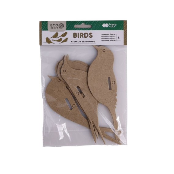 Zabawa i nauka. Możliwość zawieszenia i tworzenia dekoracji przestrzennych. Umieszczone na patyczku można wykorzystać w teatrzyku. Tektura o grubości ok. 2 mm. Naturalne kształty postaci polskich ptaków: jaskółka, sikorka, wróbel, kos, sójka. Dodatkowy otwór na włożenie oryginalnych skrzydełek zrobionych w papieru lub piórek. Wielkość elementu ok. 6 x 10 cm. 5 kształtów w opak.