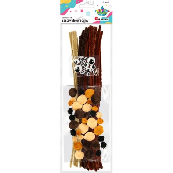 Zestaw: druciki, pompony, oczka, tonacja: brązowo-beżowa. 80 szt.