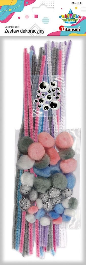 Zestaw: druciki, pompony, oczka, tonacja: pastel. Zestaw 80 szt.