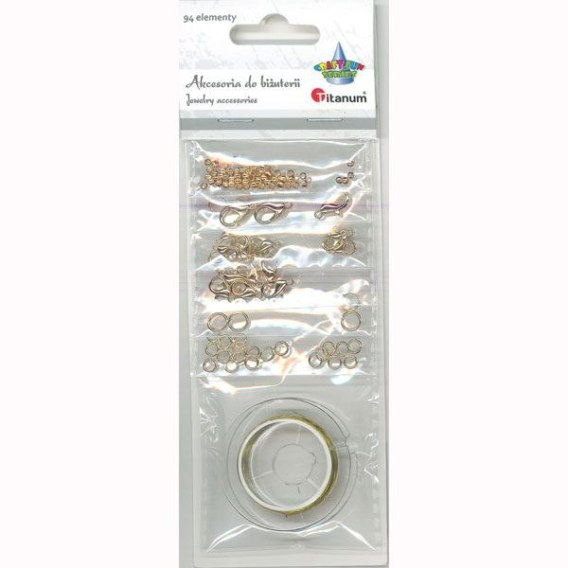 Akcesoria do biżuterii, 94 elementy, złote: 50 zacisków średnica 2 mm, 3 zapięcia 14 mm, 10 zapięć 12 mm, 5 zapięć 10 mm, 5 ringów średnica 6 mm, 20 ringów średnica 5 mm, 1 drucik 3 m.