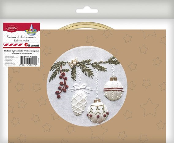 Gotowy zestaw do haftowania, zawierający: tkaninę 24x24 cm ze szkicem wzoru, tamborek o średnicy roboczej 15 cm, zestaw mulin, 3 igły, instrukcję w języku polskim. Wzór: gałązka jodły z bombkami.